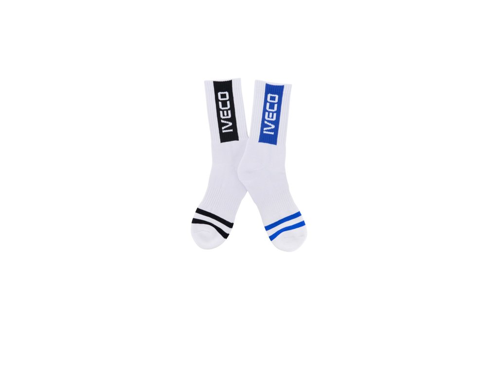 Bílé ponožky jedné velikosti, praktické a všestranné. Vyrobeno z měkké strečové tkaniny, která zajišťuje pohodlí a přizpůsobení pro každodenní použití. Minimalistický design zvýrazněný logem IVECO v modré a černé základně – viditelný při nošení tenisek a sportovní obuvi. Speciální balení: ponožky prezentované v elegantní personalizované dóze s logem IVECO.